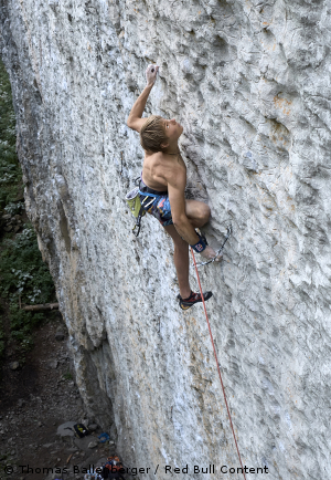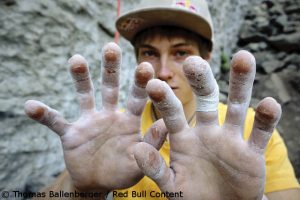 Ich trainiere eigentlich täglich. Etwa fünf Tag pro Woche gehe ich an die Kletterwand, den Rest der Zeit mache ich Ausgleichstraining und andere Kräftigungsübungen an den Ringen, der Klimmzugstange, dem Fingerboard usw.