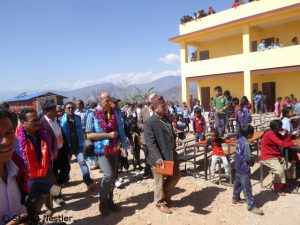 Dort werden wir „mit großem Bahnhof“ begrüßt. Mehrere hundert Schülerinnen und Schüler, Eltern, Lehrer, die Dorfhonoratioren und andere Bewohner von Thulosirubari erwarten uns zur feierlichen Einweihung und Übergabe der ersten beiden Gebäudeteile an das örtliche Schulkomitee – möglich gemacht durch eure Spenden für unser Hilfsprojekt „School up!“. Die alte Schule war durch das verheerende Erdbeben in Nepal am 25. April 2015 so stark beschädigt worden, dass sie hatte abgerissen werden müssen. Ende Juni 2015 hatte ich zusammen mit Ralf Dujmovits und der österreichischen Topbergsteigerin Gerlinde Kaltenbrunner „School up!“ ins Leben gerufen, um die Schule von Thulosirubari so schnell wie möglich wieder aufzubauen.