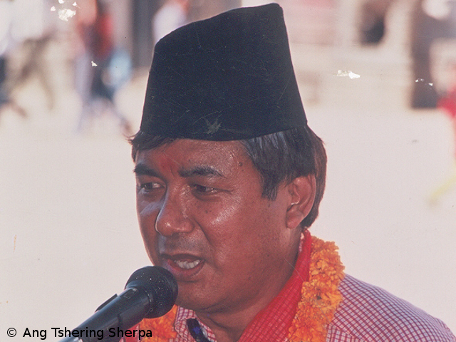 (Ich wünsche dem Everest, dass er auch weiterhin Menschen dazu inspiriert, ihre eigenen Grenzen zu erforschen und über sie hinauszugehen, immer im Bewusstsein, dass wir nur mit dem Segen von Mutter Natur den Gipfel erreichen. Der Mount Everest ist der höchste Punkt der Erde. Es liegt in der Verantwortung der ganzen Welt, dabei zu helfen, den Berg und seine Umgebung vor Umweltverschmutzung zu bewahren. Wir müssen die Schätze der Natur respektieren und beschützen. Seit 2008 organisieren wir die „Öko-Everest-Expeditionen“, damit umweltbewusste Teilnehmer, Bergsteiger, Kletterer, Trekkingurlauber, Umweltschützer, Journalisten und Unterstützer besser verstehen, wie Klimawandel und Gletscherschmelze das zerbrechliche Zuhause des Everest bedrohen. – Ang Tshering Sherpa, langjähriger Präsident des Nepalesischen Bergsteiger-Verbands NMA, Chef des Expeditionsveranstalters Asian Trekking)