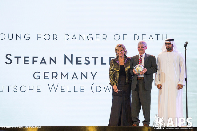 Es ist eine Riesenperle. So groß wie ein Fußball, aus Metall kunstgeschmiedet, silbern schimmernd. Der Weltverband der Sportjournalisten (AIPS) hat gestern bei einer Gala in Abu Dhabi erstmals die „Sport Media Pearl Awards“ vergeben. Es war laut AIPS der erste Sportjournalisten-Wettbewerb, der weltweit ausgeschrieben wurde, um die Arbeit der „besten Geschichten-Erzähler des Sports“ zu würdigen, weil „ohne die Geschichte der Sport nicht mehr wäre als bloß ein Spiel“. Hier sind die geballten Zahlen: 724 Beiträge in 29 Sprachen aus 86 Ländern auf fünf Kontinenten wurden in neun Kategorien eingereicht. Eine davon hieß „Journalistischer Weblog“. Ich versuchte einfach mein Glück – und unglaublich, aber wahr: „Abenteuer Sport“ wurde als bester Blog ausgezeichnet.