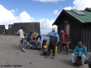 Der Krankenwagen brachte einen höhenkranken Bergsteiger talwärts. Zuvor war er auf einer abenteuerlich anmutenden Rolltrage den Berg hinunter transportiert worden. „Es ging ihm wirklich schlecht“, sagte mir einer der einheimischen Helfer. Bis auf den Mountainbiker Thomas war unsere komplette Gruppe heute von der Mandara Hut über 1000 Höhenmeter zur Horombo Hut auf 3700 Metern gewandert. Alle kamen gut an, fast alle sind wohlauf. Lediglich eine Wanderin klagte über Schwindel und Übelkeit. „Das sind eindeutig erste Zeichen der akuten Höhenkrankheit, aber nichts, worüber man sich große Sorgen machen müsste“, berichtete Tim Jäcker. „Alles unter Kontrolle.“ Der Arzt verabreichte ihr ein Medikament, am Abend ging es ihr bereits besser.