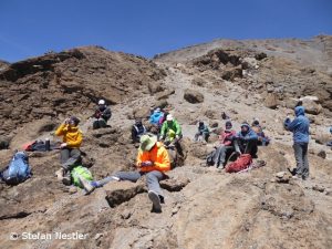 Wir hatten heute einen weiteren Tag zur Akklimatisierung auf 4720 Metern. 17 Teilnehmer stiegen den staubigen Vulkanabhang bis auf eine Höhe von 5030 Metern hinauf. „Ich habe es geschafft“, freute sich Monika, als sie am Umkehrpunkt eintraf. Die 64-Jährige, die schon als Kind davon träumte, den Kilimandscharo zu besteigen, geht konsequent ihr eigenes, etwas langsameres Tempo und erreichte damit bisher stets das Tagesziel. „Die Guides sagen, dass ich gute Chancen habe, auch den Gipfel zu schaffen. Mal sehen!“