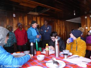 Jetzt gilt es. Heute Abend um 23 Uhr werden wir aufbrechen. So wie es jetzt, wenige Stunden zuvor, aussieht, werden bis auf Gerd, unseren Ältesten mit 76 Jahren, wohl alle noch verbliebenen 20 Expeditionsteilnehmer einen Gipfelversuch machen. Zuvor nimmt Christian Kreisel aus dem Marburger Ärzteteam bei allen weitere Blutproben. Christian wird als möglicher Nothelfer in der Kibo Hut zurückbleiben.