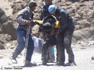 Wie nötig dies sein kann, beobachtete ich heute Mittag auf der Kibo Hut. Ein Südkoreaner, der um Mitternacht Richtung Gipfel aufgebrochen war, musste heruntergetragen werden – unfähig, auch nur einen weiteren Schritt selbstständig zu gehen. Er und eine weitere Bergsteigerin der koreanischen Expedition wurden später per Rolltragen talwärts transportiert.