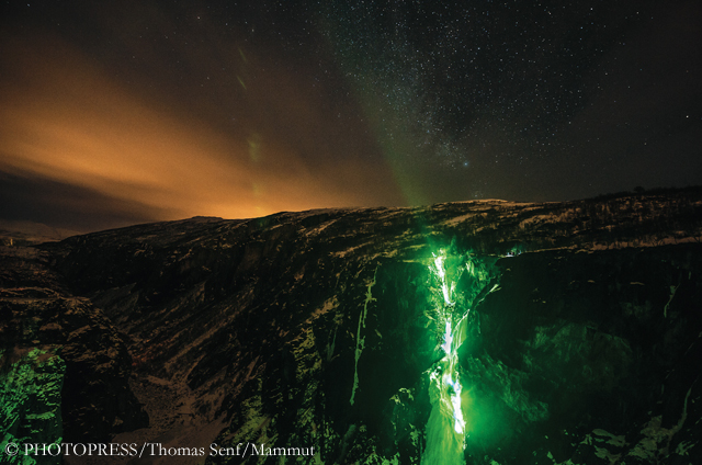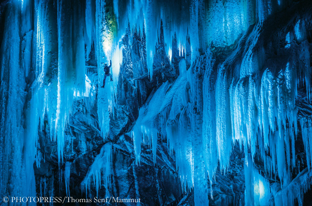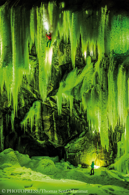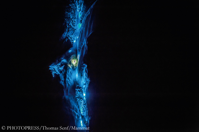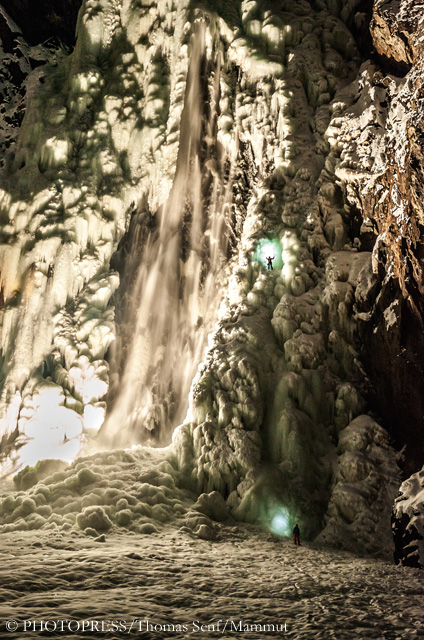 Dass Thomas Senf nicht nur ein erstklassiger Bergsteiger, sondern auch ein ausgezeichneter Fotograf ist, zeigen Bilder, die der Bergausrüster Mammut jetzt zur Verfügung gestellt hat. Entstanden sind sie Anfang des Jahres am Eidfjord im Norden Norwegens, der für seine bis zu 500 Meter hohen Eisfälle berühmt ist. Dort hat Thomas mehrere Kletterer, darunter seine Kletterpartner vom Torre Egger, Arnold und Sigrist, beim nächtlichen Eisklettern fotografiert. Ausgeleuchtet wurde die Szenerie mit farbigen Leuchtfackeln und Scheinwerfern. Die tollen Bilder, die fast märchenhaft wirken, will ich euch nicht vorenthalten. Seht selbst!
