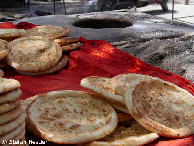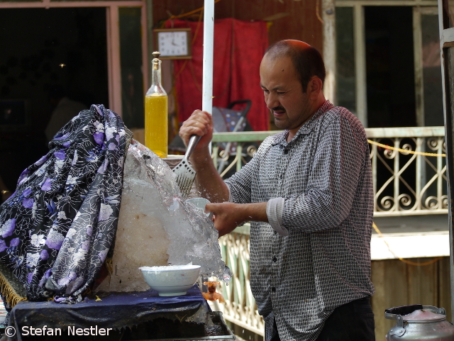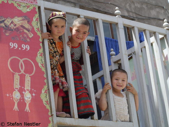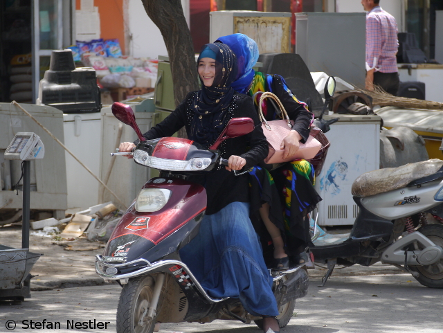 Das dürfte eine der kürzesten Stadtrundfahrten in der Geschichte Kaschgars gewesen sein. An unserem letzten Tag in der Metropole an der Seidenstraße will uns Fremdenführer Akbar einige Sehenswürdigkeiten der Stadt zeigen. Mit dem Bus fahren wir zunächst zur Apak Hoja Mazar. In diesem Mausoleum, das 1640 erbaut wurde, sind 72 Mitglieder des Hoja-Clans bestattet. Das waren Uiguren, die zu ihrer Zeit ganz gut darin waren, mit ihren Truppen gegen scheinbar übermächtige Gegner anzutreten und sich einiges unter den Nagel zu reißen, was ihnen vorher nicht gehört hatte. Das Mausoleum ist ein sehr gut erhaltenes, schönes Bauwerk. „Seit fast 400 Jahren ist die Farbe unverändert, selbst die weißen Teile“, erzählt Akbar. „Ein kleines Wunder“. Das hätten wir auch gebraucht, um zu unserem zweiten Tagesziel zu gelangen, der großen Moschee Kaschgars. Es bleibt aus, wir stranden an einer Straßensperre.