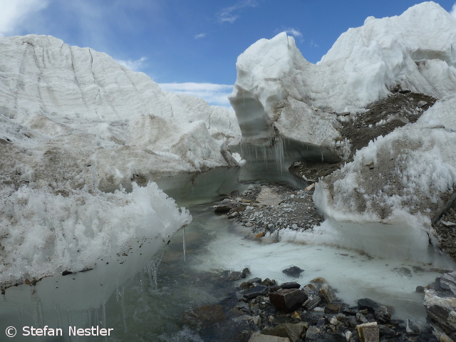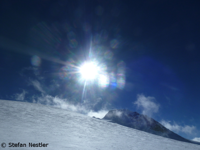 Verdammt, nicht jetzt! Gerade habe ich aus dem Gletscherbruch ins sanft ansteigende Gelände gequert, da bildet sich mein Schlafsack ein, er sei ein Fußball. Er rutscht aus dem Rucksackdeckel und hüpft munter bergab. Instinktiv rase ich hinterher. Mit dem schweren Gepäck auf dem Rücken und den klobigen Expeditionsschuhen an den Füßen sehe ich wahrscheinlich aus wie ein Michelin-Männchen beim Joggen. 20 Meter tiefer habe ich den blöden Sack eingeholt und stoppe ihn mit dem rechten Fuß. Auf etwa 4400 Metern wirkt so eine Sprinteinlage mit Gepäck, als hätte dir jemand den Sauerstoffhahn zugedreht. Ich schnappe nach Luft und brauche ein, zwei Minuten, bis sich mein Puls wieder beruhigt hat und ich gleichmäßig atme. Immerhin war ich schneller als der Schlafsack. Andernfalls hätte ich noch gut 100 Meter tiefer steigen können, ehe seine Talfahrt im abflachenden Gelände ein Ende gefunden hätte.