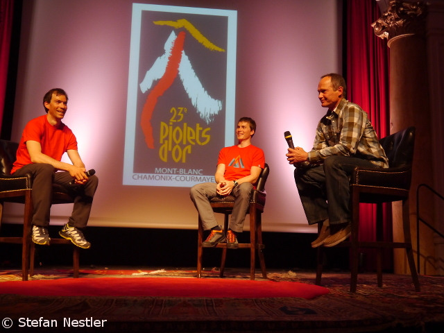 Such as the climbers of the three teams that were nominated for this year’s Piolets d’Or, the „Oscar for mountaineers“. Their achievements were also presented during the evening in Chamonix: The Americans Tommy Caldwell and Alex Honnold (who could not come to France due to other commitments) succeeded in completing the full traverse of the Fitz Roy range in Patagonia, over seven summits with a total of 4,000 meters of ascent, within five days.