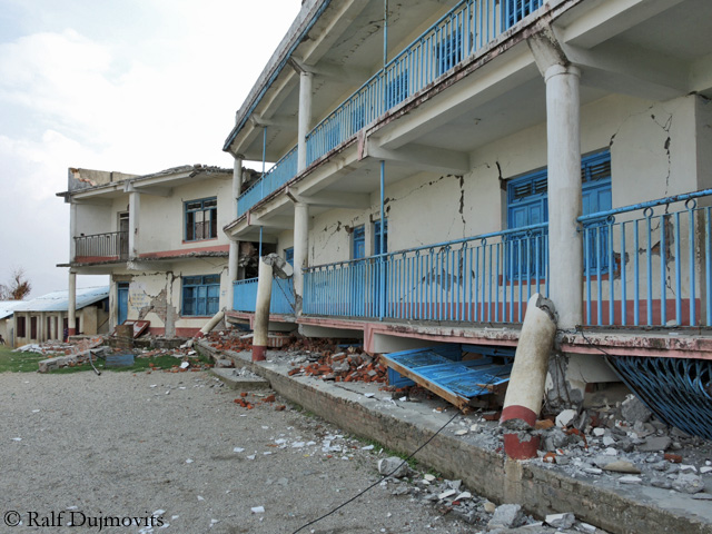 It looked as if the magician David Copperfield had staged one of his grand illusions. “The school was much smaller than I remembered it”, Ralf Dujmovits tells me. “First I didn’t even realize that the ground floor had just slumped down. The upper parts of the building were still standing. Only when I got loser, I saw the extent of damage. That really brought tears to my eyes.” Germany’s most successful high altitude climber visited the “Gerlinde and Ralf School” in Thulosirubari one and a half weeks after the devastating earthquake in Nepal. Gerlinde Kaltenbrunner and Ralf Dujmovits had given financial support to the project of the German aid organization “Nepalhilfe Beilngries” and thus had made it possible that the school had been opened in 2009. “If you suddenly realize that the building has to be demolished, you just begin to cry”, says Ralf. You all can help to rebuild the school by supporting the campaign “School up!”.