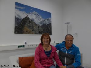 Bottled oxygen on a mountain has always been out of the question for me. On principle. Today I made an exception – for a “virtual mountain”. To be able to visit Ralf Dujmovits, the only German mountaineer who has scaled all 14 eight-thousanders, and his partner, the Canadian climber Nancy Hansen, it is mandatory to use a breathing mask. After two weeks in the hypoxia chamber of the German Aerospace Center (DLR) in Cologne, the two test persons have reached the simulated target altitude of 7,112 meters. The percentage of oxygen in the air, normally 21 percent, was gradually reduced to eight percent by adding nitrogen. “It’s like climbing a mountain. The acclimatization is almost done, now we’re heading for the summit,” says Ralf. “The time on the summit will be of course much longer.”