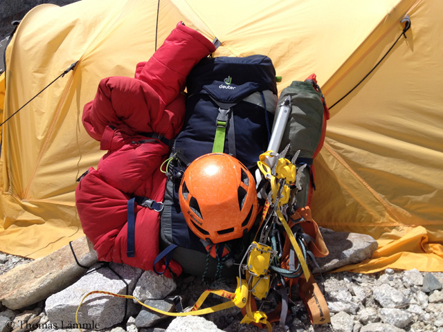 On 16 May, I reached Everest Base Camp. I was shocked by the crowds and the helicopter noise. I just wanted to get away. I descended to Lobuche (4,900 m) to regenerate in a lodge. Actually I wanted to stand on top of Lhotse on 23 May. However, Karl Gabl predicted heavy snowfall after 22 May and advised me to wait for this precipitation period and only then to start a summit attempt. I was uncomfortable with this thought, perhaps the snowfall was already the harbinger of the monsoon. So I choose a “slap bang” action to reach the summit before 22 May.