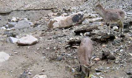 Im Gefolge der Yaks aber waren noch weitere Tiere im Basislager aufgetaucht. Zunächst ein schwarzer zotteliger Hund, bei dem mir bis zum Schluss nicht klar war, ob er einen Job als Hirtenhund hatte oder ein gemeiner Straßenköter war, der sich im chinesischen Basislager der Karawane angeschlossen hatte. Ich sah ihn nur einmal schnell laufen und hörte ihn nur einmal laut bellen: als er hinter dem verschreckten Rehbock Rocky die Gletschermoräne hinaufjagte.