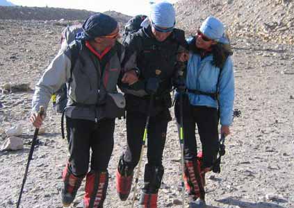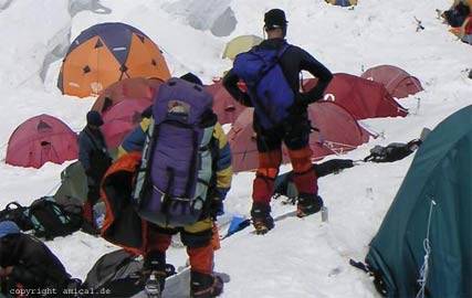 Nach einem über zehn Stunden langen Fußmarsch über den östlichen und den zentralen Rongbukgletscher treffen Gerlinde, Ralf und Hiro am späten Nachmittag wieder im Basislager ein. Hiro schleppt sich mit buchstäblich letzter Kraft ins Ziel.