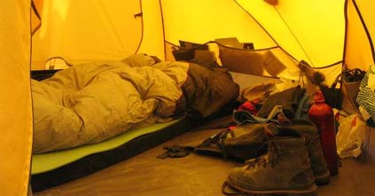 In mein Zelt habe ich Sie nie blicken lassen. Das war mein Schlafzimmer, mein Refugium, mein privater Raum. Heute dürfen Sie hereinschauen. Ich habe das Zelt extra für Sie fotografiert. Sie sehen nichts Spektakuläres: einen Daunenschlafsack, einen Rucksack, ein Paar verstaubte Bergschuhe. Wenn Sie in die Zelttaschen am Rand blicken, ahnen sie vielleicht, dass ich nicht der Ordentlichste bin. Die dreckigen Klamotten passten leider nicht in den Bildausschnitt. Und den feinen Everest-Staub auf dem Boden und auch sonst überall können Sie nur ahnen.