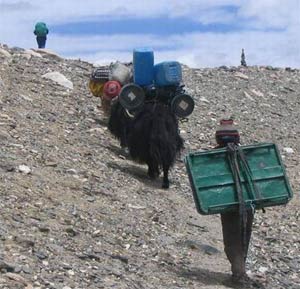Doppelter Aufbruch: Während Gerlinde, Ralf und Hiro heute am Everest-Nordgrat bis auf 7500 Meter aufsteigen wollen, hat die tschechische Expedition den Heimweg angetreten. Auf 19 Yaks verstauten sie ihr Gepäck. „So etwas habe ich noch nie erlebt“, sagte Expeditionsleiter Josef Simunek. „Mehr als fünf Wochen waren wir hier und hatten nicht einmal drei Tage am Stück, an denen wir kontinuierlich am Berg arbeiten konnten.“