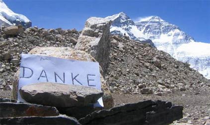 Wir sind ein Expeditionsteam von fünf Personen, doch dahinter steht eine wesentlich größere Mannschaft. Hiro ist verheiratet, seine Frau wartet seit zwei Monaten in Tokio auf ihn. Gleiches gilt für Ralfs Sohn Joshi in Bühlertal im Schwarzwald. Gerlinde kommt aus einer großen Familie, die in Spital in Oberösterreich mitzittert und mitfiebert. Unser Koch Sitaram hat sich Anfang April in Kathmandu von seiner Frau und seinen drei Kindern verabschiedet. Meine Frau und fünf Kinder müssen in Köln seit Anfang Mai ohne mich auskommen. Neben diesem engeren Kreis gibt es einen weiteren: Verwandte, Freunde, tolerante Chefs und Kollegen -und auch ein paar Sponsoren, ohne die eine Expedition wie diese nicht zustande käme.