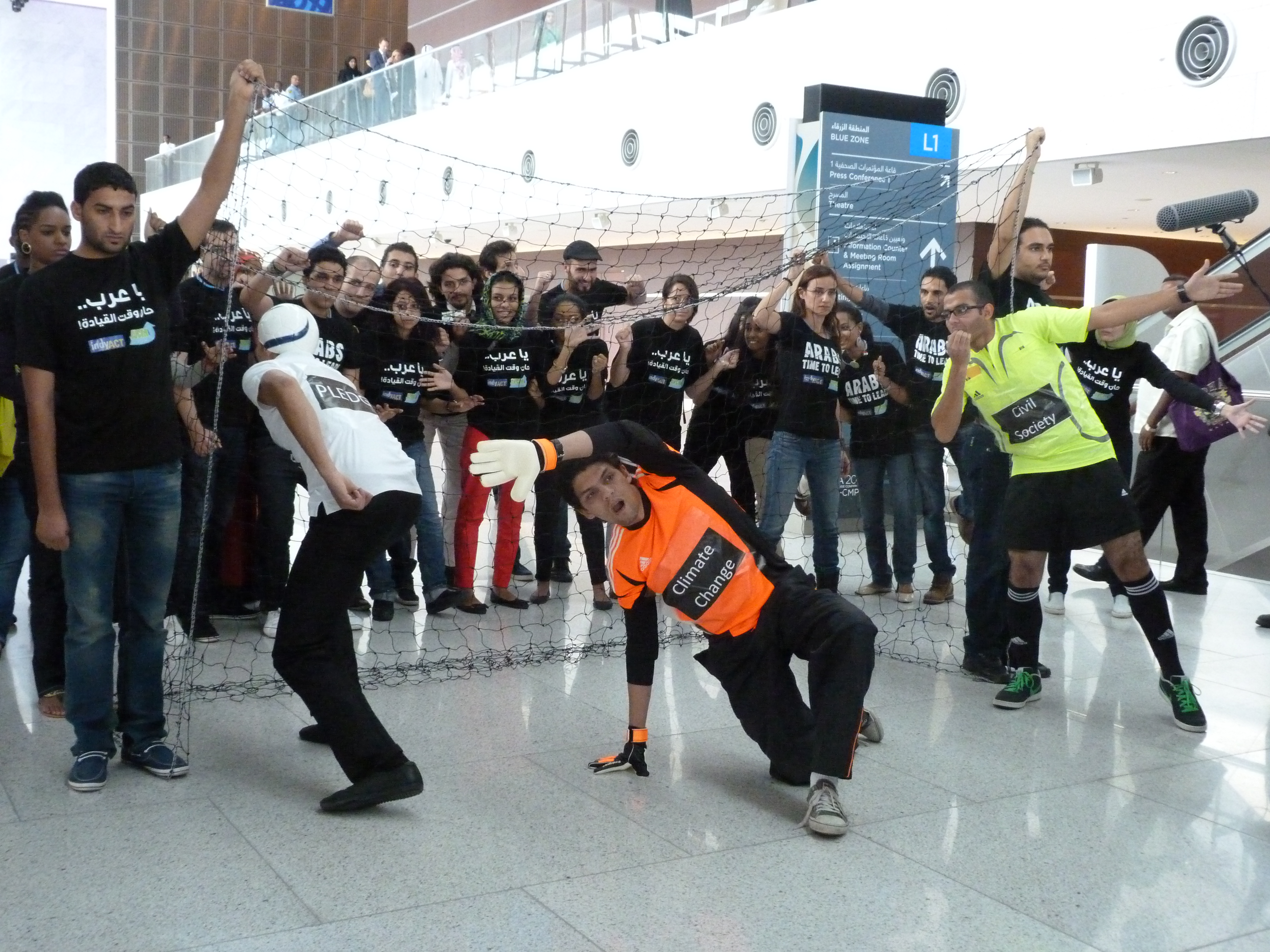 At the same time, downstairs, a joyful, colourfoul crowd of young people have come together for what looks like a soccer game. The Arab Youth Climate Movement (AYCM) is holding their own version of a press conference – a much noisier and more chaotic one. AYCM is the first climate movement the Arab world has seen in history. Hundreds of young activists from Qatar and other Arab countries have joined together in the forerun to COP 18.