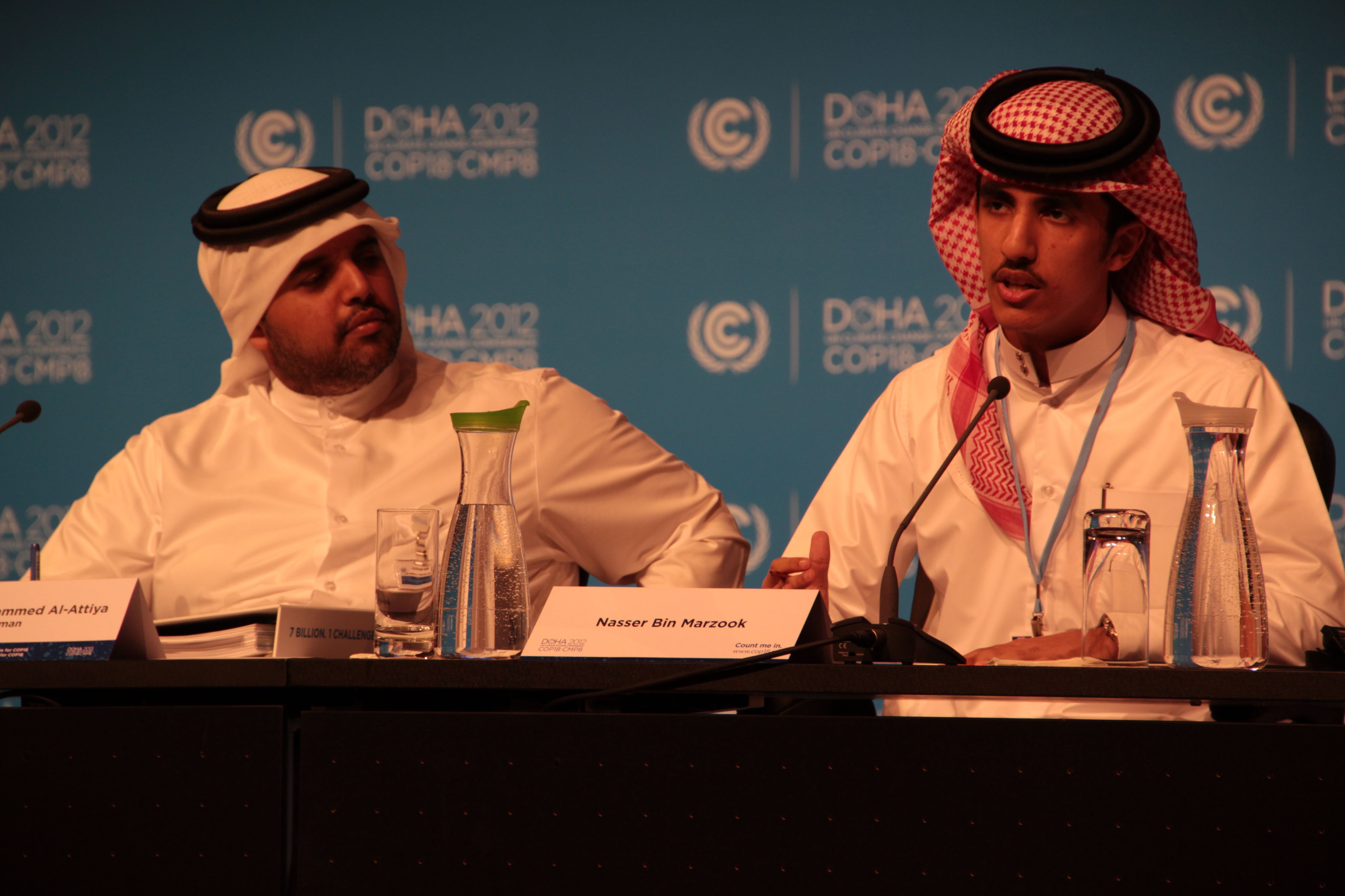 „When I was 18 years old, there was only one flight out of London a week. Now there are seven.“ The Quatari Chairman of the Organizing Committee for COP18, his Excellency Fahad Bin Mohammed Al-Attiya, highlights new study opportunities for young Qataris – like the young Nasser Bin Marzook, sitting next to him on the panel. Nasser and his three fellow „youth ambassadors“, appointed by the government, look down into an almost deserted audience with a mixture of shyness and pride.