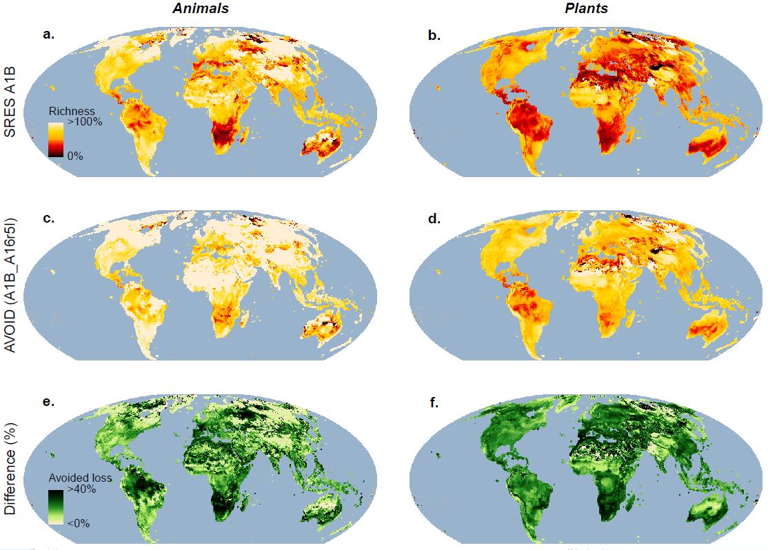 Species richness in 2080: The geographic ranges of common plants and animals will shrink globally and thus species richness will decline almost everywhere. The top two maps show how species richness declines without mitigation, with the red areas showing the greatest declines. Plants, reptiles and particularly amphibians are expected to be at highest risk. Sub-Saharan Africa, Central America, Amazonia and Australia would lose the most species of plants and animals. The lower four maps show how the declines can be reduced by mitigation. (Credit: Nature Climate Change)