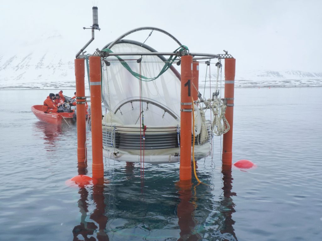 The mesocosms are used to research the effects of acidification on ocean-dwellers. (I.Quaile, Svalbard)