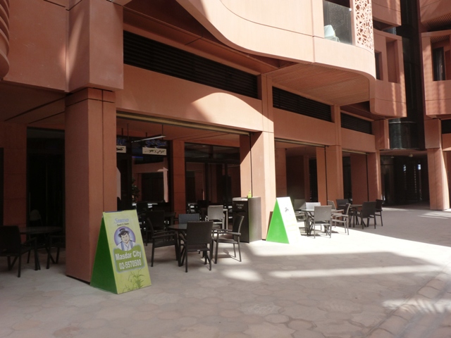 This is an impression of the iconic architecture of Masdar around a pleasantly cool courtyard. (The modest gentleman on the couch is Sultan Aal Ali, in charge of Masdar’s development).