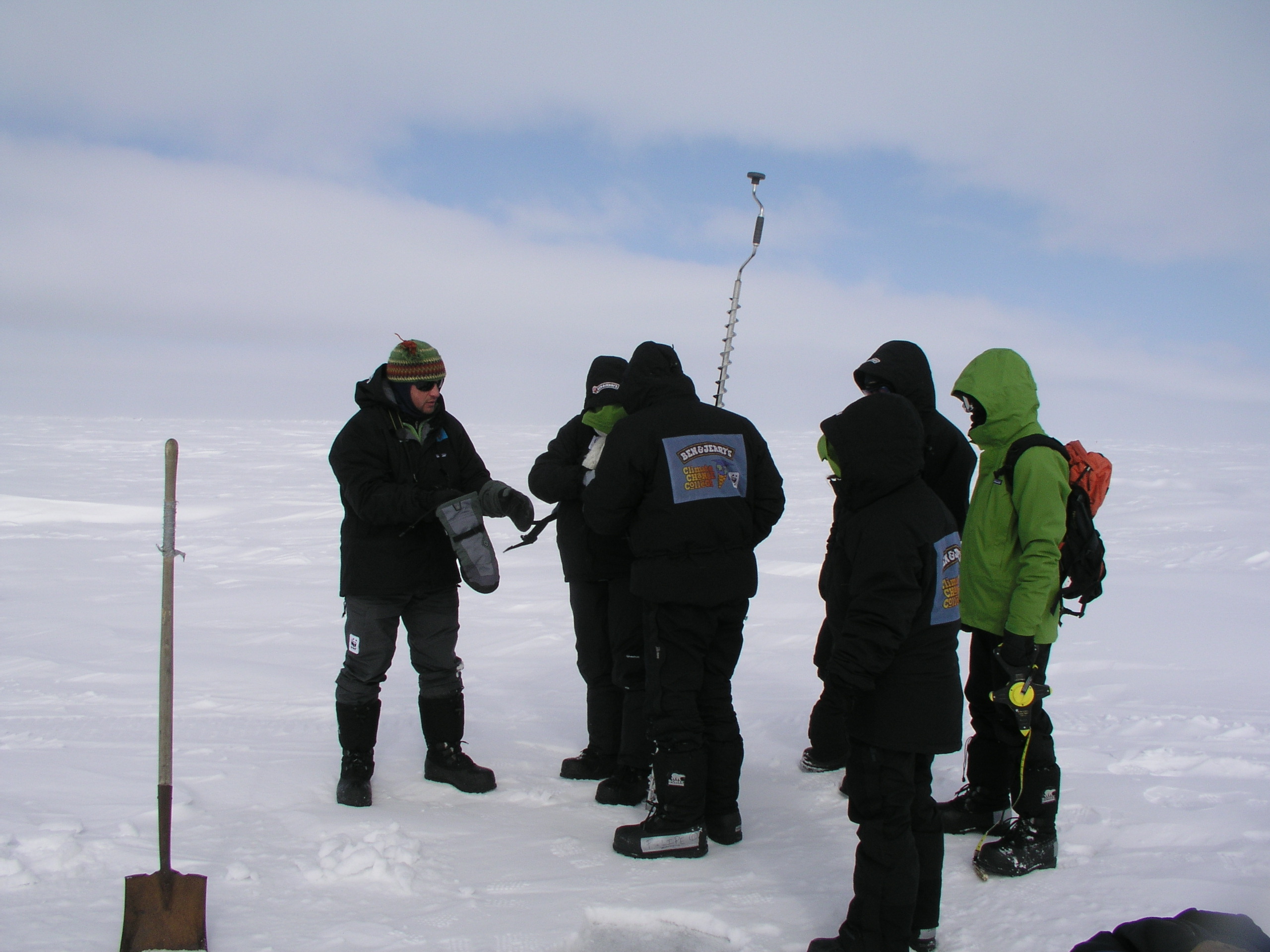 Marc Cornelissen shows climate ambassadors how to drill to measure ice thickness (i.Quaile, Alaska, 2008)