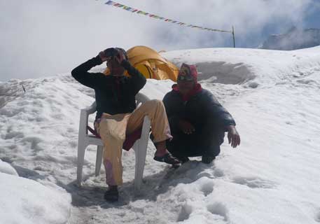 Tag zwei des Gipfelversuchs: Und wieder scheint morgens die Sonne am fast wolkenlosen Himmel. Lediglich unten im Tal ballen sich ein paar Haufenwolken. Hier oben auf 4850 Metern, immerhin Mont Blanc-Höhe, ist es so warm, dass ich im T-Shirt auf einem Plastikstuhl im Freien sitze. Gemeinsam mit unserem Koch Sitaram beobachte ich mit dem Fernglas, wie die Bergsteiger unseres Teams von Lager eins auf 5680 Metern nach Lager zwei auf 6750 Metern aufsteigen. Kleine schwarze Punkte auf der weißen Leinwand des Manaslu-Gletschers.