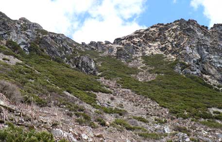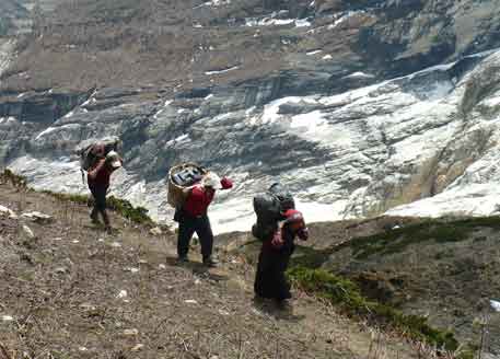 In kurzen Abständen machen sich also Hiro, Josef, Angelo, Peter, Helmar, Rolf, Joachim und ich auf den Weg Richtung Basislager. Wir folgen dem Yak-Pfad, dem einzig möglichen, dem leicht zu erkennenden, nicht zu verfehlenden. Auf 4360 Metern Höhe treffen wir acht uns auf einem Sattel wieder. Hier endet die Spur, aber 150 Meter tiefer sehen wir die ersten Träger einer langen Karawane, die bergauf steigt. Verdammt, wir haben uns verstiegen! Es gibt keine Alternative: wir müssen hinunter, quer durch die dichten Sträucher am Hang. 150 verschenkte Höhenmeter. Shit happens! Ralf meint später, wir sollten den Umweg ganz einfach als zusätzliches Training verbuchen. Na, dann.