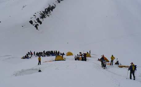 Doch irgendwann, nach einem endlos erscheinenden Moränengrat erreiche auch ich – als einer der letzten – den schneebedeckten Platz auf 4850 Meter Höhe, an dem unser Basislager stehen soll. Als die Träger entlohnt und abgezogen sind, beginnen wir, die Stellen für unsere Zelte zu planieren. Gerade will ich mein Zelt aufbauen, da beginnt es heftig zu schneien. Shit happens.