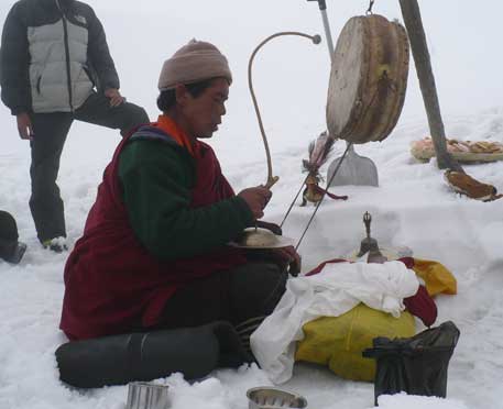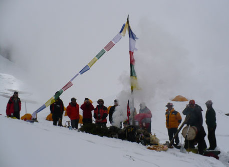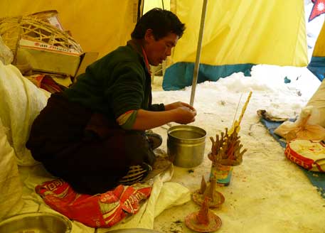 „Hallo, kommt alle zur Puja!“ Ralf ruft die Expeditionsmitglieder zu einer traditionellen Gebetszeremonie des tibetischen Buddhismus. Dafür ist Sangip Lama, ein Mönch aus dem Kloster von Sama, am Morgen ins Basislager aufgestiegen. Anderthalb Stunden lang hat er im Küchenzelt Tsampa, geröstetes Gerstenmehl, mit Butter verknetet und daraus feine Skulpturen geformt. Sie symbolisieren buddhistische Gottheiten und den tibetischen Religionsstifter Padmasambhava.