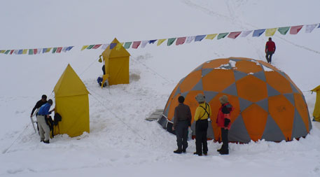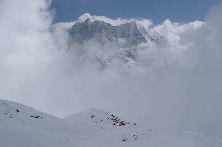 Die Bergsteiger sind von ihrem ersten Aufstieg zu Lager 1 auf 5680 Metern heile zurückgekehrt – nach gut sechs Stunden, vor dem großen Schnee. Fast scheint es so, als würden sich die Niederschläge auf unser kleines Basislager konzentrieren. „Oben lag gar nicht so viel Neuschnee“, sagte Richard nach seiner Rückkehr.