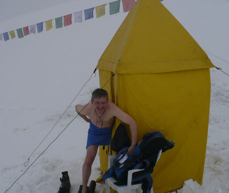 Nach einer Weile bin ich an der Reihe. Ich schlüpfe schnell aus den Kleidern und stehe, ganz Adam, unter dem prall gefüllten Wassersack. Langsam drehe ich den Hahn auf und ein dünner Strahl angenehm warmen Wassers ergießt sich über die Mischung aus getrocknetem Schweiß und Dreck auf meiner Haut. Shampoo und Seife kommen zum Einsatz. Zu meinen Füßen bildet sich ein kleiner See, über dessen Farbe ich lieber schweige. Der Sack ist noch halb voll, der Dreck aber ganz weg. Jetzt kann ich das warme Wasser auf der Haut richtig genießen. Ein wohliges Gefühl macht sich breit, ich muss laut singen. „Any problem, Stefan-dai?“, ruft Sitaram von außen und lacht sich schief. „No problem!“ Ich bin einfach nur sauber und fühle mich auch so. Wellness pur im Basislager – wenn es bloß nicht dauernd schneien würde.