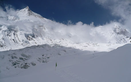 Regelmäßig zieht sich die Spur vom Basislager weg Richtung Manaslu-Gletscher. Alle haben Schneeschuhe unter ihre normalen Bergschuhe geschnallt, um nicht bei jedem Schritt tief einzusinken. Im Abstand von etwa 50 Metern stecken Bambusstöcke mit Fähnchen im Schnee. Sie erleichtern bei Nebel oder Schneefall die Orientierung.