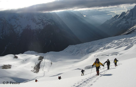 10 Uhr früh und schon wieder schneit es im Basislager. Keine dicken Flocken, sondern Schneegriesel, die aussehen wie kleine Styroporkügelchen. Seit unserer Ankunft wiederholt sich dieses Wetterszenario täglich. Wir werden von Sonnenstrahlen geweckt. Doch nach dem Frühstück ziehen Wolken aus dem Tal herauf, die zum Teil ergiebigen Schneefall bringen.