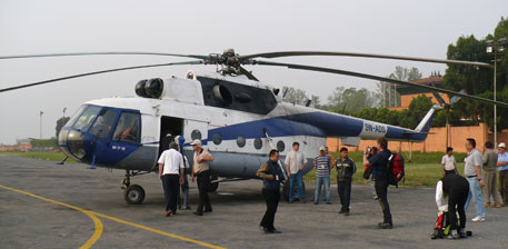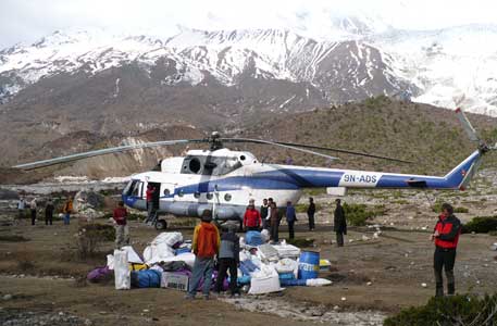 Unser Koch Sitaram und weitere Helfer eilen herbei. Wir beginnen, den Helikopter zu entladen.Die russischen Piloten rauchen derweil ihre nächsten Zigaretten. Wenig später entschwebt der Hubschrauber, zurück nach Kathmandu, um die restlichen sechs Expeditionsmitglieder abzuholen.