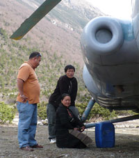 Während wir das Gepäck entladen, zapfen sich einige Einheimische aus dem Dorf Sama Kerosin aus den Tanks des Hubschraubers ab. Die Piloten stehen lächelnd daneben – und rauchen.