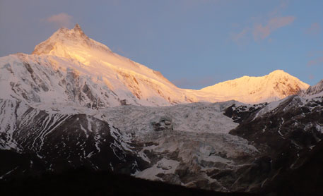 Der Manaslu ist ein Frühaufsteher. Um 5.30 Uhr zeigt er sich erstmals in seiner ganzen Pracht. Wenig später lecken die ersten Sonnenstrahlen an seinem 8163 Meter hohen Gipfel. Glücklicherweise ist mein Zelt so aufgebaut, dass ich im Schlafsack liegen bleiben kann und nur den Ausguck zu öffnen brauche, um den majestätischen Anblick zu genießen. Zur Frühstückszeit um sieben Uhr ist die Audienz beendet, der Manaslu versteckt sich wieder hinter den Wolken.