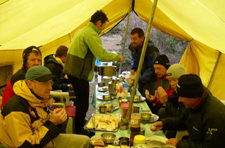 Zwei Stunden später: Wolken haben sich ins Tal geschoben. Ralf wird langsam nervös. Gerade als er sein Satellitentelefon auspackt, um sich in Kathmandu nach dem Verbleib der zweiten Gruppe zu erkundigen, hören wir erst das vertraute Geknatter. Dann erblicken wir den Hubschrauber, der erneut sicher aufsetzt. Das Expeditionsteam ist wieder vereint.