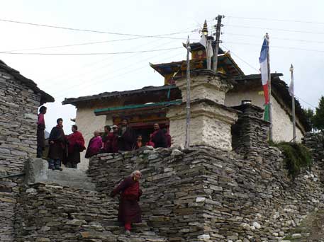 Zur Ruhe kommen wir bei einem Besuch in der Pemachheling Gompa, dem kleinen Kloster oberhalb des Dorfes Sama. Die Mönche unterbrechen ihre Gebete, um uns willkommen zu heißen. Ralf überreicht eine Spende für das Kloster.