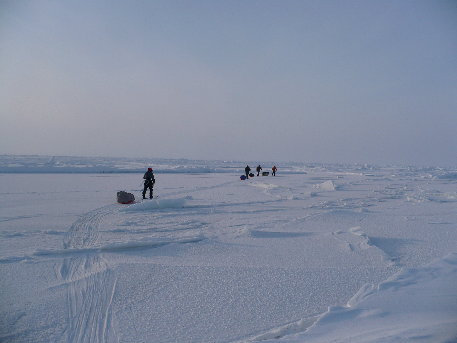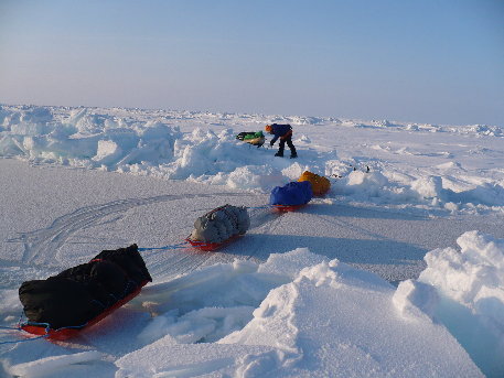 Um 9.30 Uhr sind Zelte und Gepäck verstaut. Wir brechen zur letzten Etappe auf. Gott sei Dank bläst der Wind, der immer stärker wird, in unseren Rücken. Drei Rinnen müssen wir überqueren. Man sieht, dass hier vor kurzem noch offenes Wasser war. Doch die Eisdecke ist dick genug, dass sie uns trägt. Wir kommen gut voran.
