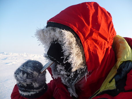 Währenddessen versuchten wir, uns mit Armkreisen und anderen gymnastischen Übungen warm zu halten. Doch es wollte nicht gelingen. Der Wind drang durch. Als Thomas zurückkehrte und wir ihm zu einer schmalen Stelle der Rinne folgten, merkte ich plötzlich, dass sich an meinem Kinn Eis bildete und ich dort kein Gefühl mehr verspürte. Die Neoprenmaske war verrutscht. Ich bat Frank nachzusehen. Er blickte mich entsetzt an. „Dein Kinn ist ja schneeweiß, das erfriert dir!“ Schnell zog er einen Handschuh aus und presste seine warme Hand auf mein Kinn. Frank begann, die betroffene Stelle warm zu reiben. Dabei hielt ich meine Wollhandschuhe über seine Finger, damit ihnen nicht das Gleiche widerfuhr wie meinem Kinn. Die Farbe kehrte zurück, das Kinn wurde wieder richtig durchblutet. Erste Hilfe in Nordpolnähe. Danke, Frank!