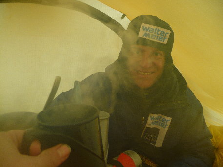 Ich kann den Nordpol fast schon riechen. Das liegt nicht an meiner dicken leistungsfähigen Nase, sondern an meinem Zeltnachbarn Eugen, der eben seine Füße gelüftet hat. Unsere riechen übrigens auch nicht besser. Schließlich stecken sie tagsüber in Plastiktüten, die als Dampfsperre dienen.