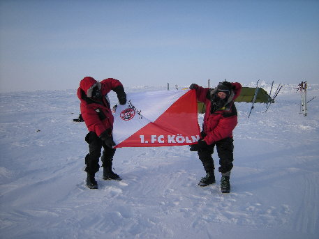 Versprochen ist versprochen. Ein Rätsel gilt es noch zu lösen. Die Fahne, die ich zum Nordpol mitgenommen habe, war natürlich die meines lebensbegleitenden Fußballvereins 1. FC Köln. Einige Kommentatoren des Blogs hatten das ja schon vermutet. Da mir mein Schlitten Poldi im Polareis wirklich sehr gute Dienste erwiesen hat (Hoffentlich spielt er in der nächsten Saison auch auf diesem Niveau in Köln Fußball!), war die Wahl auch gerechtfertigt.