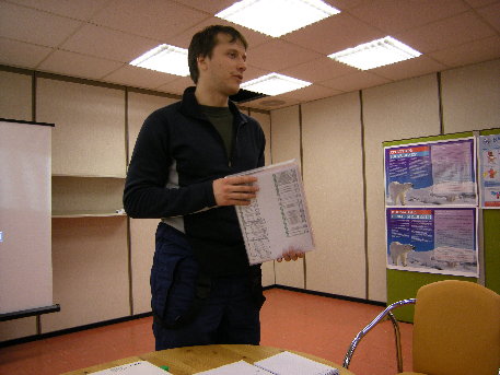 Wie in einer Schulklasse saßen wir vor dem Pult, hinter dem Lehrer Leonid stand. Zu dessen Leidwesen funktionierte der Beamer nicht. Der junge Russe musste in gebrochenem Englisch in Worte fassen, was uns eigentlich per Computer gesagt werden sollte. Etwa, dass wir uns unbedingt 20 Minuten vor dem Ende des Flugs anschnallen sollten. Denn wir müssten mit einer harten Landung und einer abrupten Bremsung auf der kurzen Eispiste rechnen. Nichts für schwache Nerven und schwache Blasen.