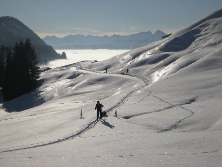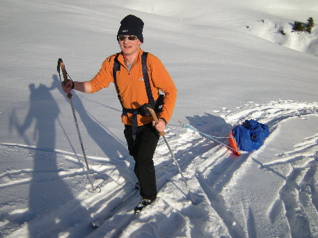 Thomas zeigt uns, wie wir die Zuggurte anlegen sollen. Die Schlitten sind leicht bepackt, mit Zelt, Kocher, Schlafmatte, Schlafsack und dem, was man sonst noch für eine Übernachtung im Freien braucht. Wir schlüpfen in die Skibindung und los geht´s. Solange der Pfad kaum ansteigt, gehorcht mir der Schlitten und ich denke noch: Gar nicht so schwer, wie ich annahm. Doch hinter einer Hütte endet der Weg. Jetzt ziehen wir unsere Spur durch den Neuschnee bergauf. Der Schlitten kippt erstmals zur Seite. Ich richte ihn wieder auf. Fünf Meter weiter das gleiche Spiel. Nach der vierten Wiederholung beginne ich, leise vor mich hinzufluchen. „Ihr müsst eure Schlitten taufen“, sagt Thomas und grinst, „dann ist es leichter, mit ihnen zu schimpfen.“