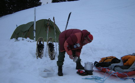 Nun demonstriert uns Thomas, wie der Kocher funktioniert. „Wir kochen im Vorzelt und liegen dabei im Schlafsack. Wenn du bei 20, 30 Grad minus draußen sitzt, erfrierst du halt, oder?“ Wo er recht hat, hat er recht. Und so geht es: Pumpen, damit Druck auf die Leitung kommt, Hahn vorsichtig aufdrehen, bis ein wenig Benzin an der Brennstelle herausspritzt, „nicht zu viel, sonst wird die Stichflamme zu hoch“, Hahn wieder zu, jetzt mit Streichholz oder Feuerzeug entzünden, „keine Angst, wenn die Flamme kurz hoch auflodert, das macht dem Zelt nichts“, warten, bis es beginnt zu zischen, Hahn aufdrehen, Topf mit Eis drauf, fertig. Hört sich ganz einfach an. Frank probiert es und macht alles richtig. Thomas ist zufrieden. „Und morgen früh bist du dran, Stefan!“