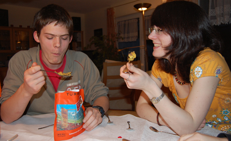 Der spannende Augenblick: Jeder gräbt seine Gabel in den Lapskaus und kostet. „Schmeckt eigentlich ganz gut“, sagt Yvonne, fast wie Mamas Möhren-Kartoffel-Eintopf, „wobei der Nachgeschmack eklig ist“. Chantal beschwert sich, dass etwas Hartes im Brei sei. „So schlimm wie es aussieht, schmeckt es nicht“, meint Sarah. „Gar nicht übel. Darf ich den Rest haben?“, witzelt Björn, schiebt allerdings nach, dass der Lapskaus ein bisschen salzig geraten sei. Das finden auch die anderen. Allgemein kommt der Lapskaus im Urteil der Familien-Jury aber ganz gut weg. „Schmeckt wie Kantinen-Eintopf“, bringt es meine Frau Veronika auf den Punkt.