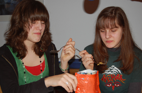 Jan reißt die Packung auf. „Iiiiii“, ist die erste Reaktion meiner Töchter Sarah, Chantal und Yvonne, auf das, was sie im Innern erblicken. „Das ist ja voll eklig, sieht aus wie getrocknete K …“ (Originalzitat kann im Audio unter dem Text nachgehört werden). Jetzt geben wir heißes Wasser in die Alu-Tüte, rühren gut um, verschließen die Packung wieder und warten fünf Minuten.