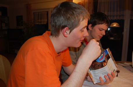 „Vor dem Nachtisch wird der Hauptgang aufgegessen“, mahnt Björn zur Disziplin. Jan erbarmt sich des Restes. Der Haselnuss-Pudding ist mit kaltem Wasser aufgeschüttet worden. Zehn Minuten hat er gezogen. „Ziemlich nussig, ganz gut“, findet Veronika. „Der schmeckt nach Krokant“, stellt Yvonne fest. „Eher wie Kuchenteig“, meint Sarah. Auch Chantal hat es geschmeckt: „Darf ich noch mal?“ Doch jetzt hat sich Jan das Dessert unter den Nagel gerissen und lobt die Macher: „Das hätte ich nicht besser gekonnt.“ Und Yvonne fasst die Meinung meiner Kinder zusammen: „Ich würde mich eigentlich nur noch von Nachtisch ernähren!“