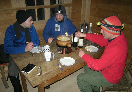 Oje, ich fühle mich wie früher beim Vokabelabfragen in der Schule. Mut zur Lücke? Ich hoffe, ich habe alles richtig verstanden. Erst einmal verdränge ich den Auftrag. Denn heute Abend gibt es in Thomas´ Berghütte eine zünftige Schweizer Käsefondue, mit einem leckeren Gläschen Wein und Wodka zum Absacken. Mit der nötigen Bettschwere ziehen wir uns ins Zelt zurück. Der Schlafsack wärmt mehr als genug, die beiden Matten unter dem Rücken sind leidlich bequem. Ich falle in einen tiefen, erholsamen Schlaf.